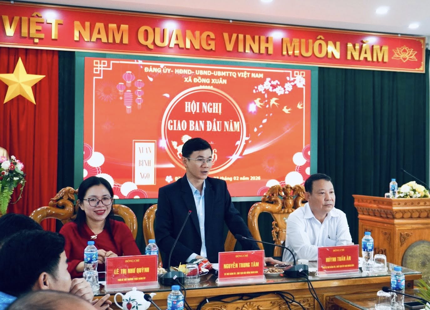 Sáng 23/02/2026 (mùng 07 tháng Giêng), tại Phòng họp Đảng ủy, Đảng ủy - HĐND - UBND- UBMTTQVN xã Đồng Xuân tổ chức Hội nghị giao ban đầu Xuân Bính Ngọ năm 2026 nhằm đánh giá tình hình vui Xuân, đón Tết Nguyên đán và triển khai nhiệm vụ trọng tâm tháng 3/2026 trên địa bàn. Các Đồng chí: Nguyễn Trung Tâm - Bí thư đảng uỷ, Chủ tịch HĐND xã; Lê Thị Như Quỳnh - Phó bí thư thường trực Đảng uỷ; Huỳnh Tuấn Ân - Phó bí thư đảng uỷ, Chủ tịch UBND xã đồng chủ trì hội nghị. Tham dự có lãnh đạo HĐND, UBND, Ủy ban MTTQ Việt Nam xã; các ban, ngành, đoàn thể; bí thư các chi bộ trực thuộc và trưởng thôn trên địa bàn.