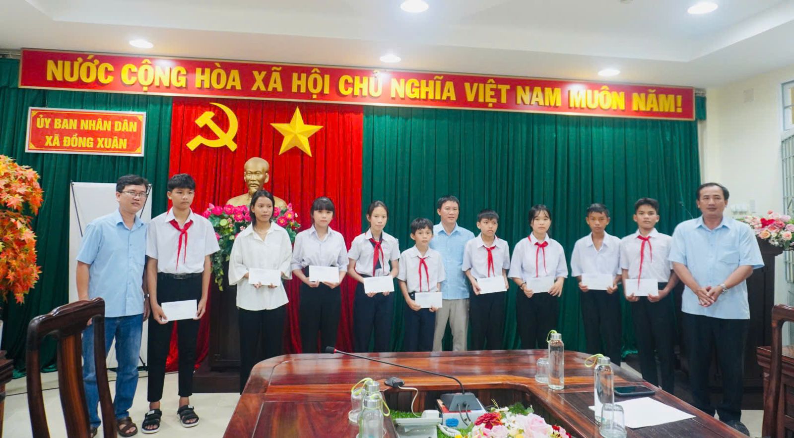 Sáng nay, ngày 20/9, tại Phòng họp UBND xã Đồng Xuân, Trung tâm Nuôi dưỡng người có công và Công tác xã hội Phú Yên phối hợp tổ chức trao học bổng Bảo trợ dài hạn năm học 2025 – 2026 và khen thưởng cho các em học sinh có hoàn cảnh đặc biệt khó khăn nhưng đạt thành tích học tập tốt, có nhiều nỗ lực vươn lên trong năm học 2024 – 2025. Về dự và trao học bổng có các đồng chí: Phạm Trần Lê - Phó Giám đốc Trung tâm Nuôi dưỡng người có công và Công tác xã hội Phú Yên; Nguyễn Ngọc Tiến - UVBTV, Phó Chủ tịch UBND xã Đồng Xuân; Nguyễn Công Chơn - Phó Trưởng phòng Văn hoá – Xã hội xã Đồng Xuân.