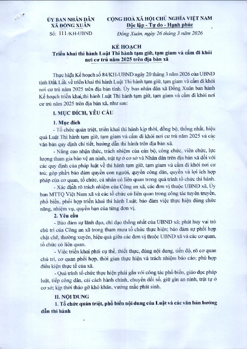 | Tiêu đề văn bản | Kế hoạch triển khai thi hành luật tạm giữ, tạm giam và cấm đi khỏi nơi cư trú năm 2025 trên địa bàn xã | ||