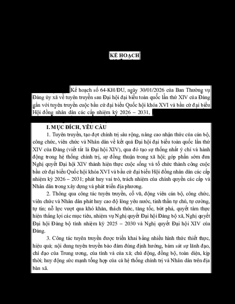 | Tiêu đề văn bản | KẾ HOẠCH Tuyên truyền sau Đại hội đại biểu toàn quốc lần thứ XIV của Đảng gắn với tuyên truyền cuộc bầu cử đại biểu Quốc hội khóa XVI và bầu cử đại biểu Hội đồng nhân dân các cấp nhiệm kỳ 2026 – 2031 | ||