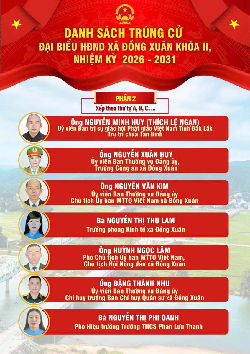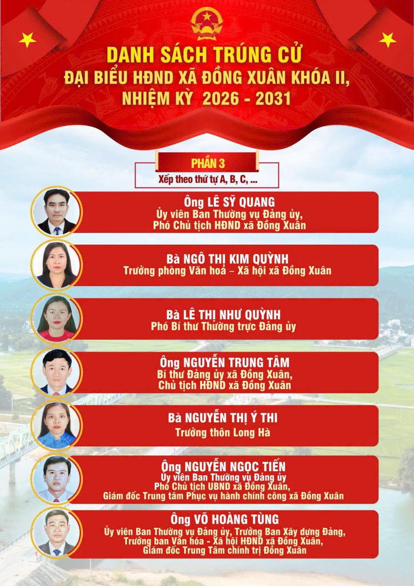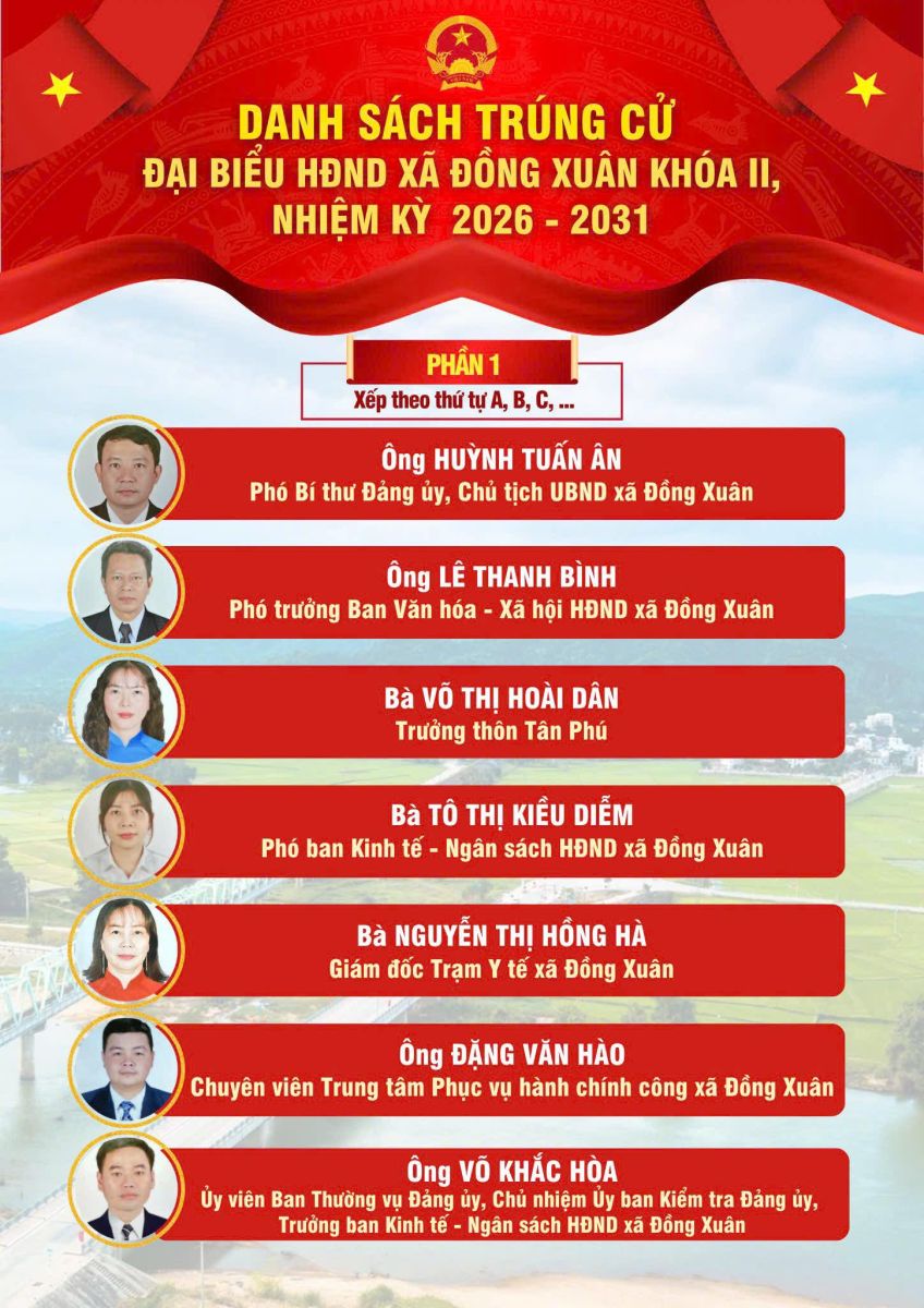 Danh sách 21 đại biểu trúng cử đại biểu HĐND xã Đồng Xuân khóa II, nhiệm kỳ 2026–2031 là những đại diện tiêu biểu cho ý chí, nguyện vọng và quyền làm chủ của Nhân dân trên địa bàn.