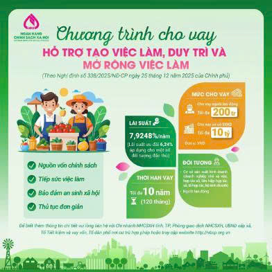 Ngân hàng Chính sách xã hội Đồng Xuân triển khai chương trình cho vay Hỗ trợ tạo việc làm, duy trì và mở rộng việc làm theo Nghị định 338/2025/NĐ-CP Chính phủ vừa ban hành Nghị định số 338/2025/NĐ-CP quy định chi tiết một số điều của Luật Việc làm về chính sách hỗ trợ tạo việc làm. Trong đó đáng chú ý là các quy định về cho vay hỗ trợ tạo việc làm, duy trì, mở rộng việc làm.
