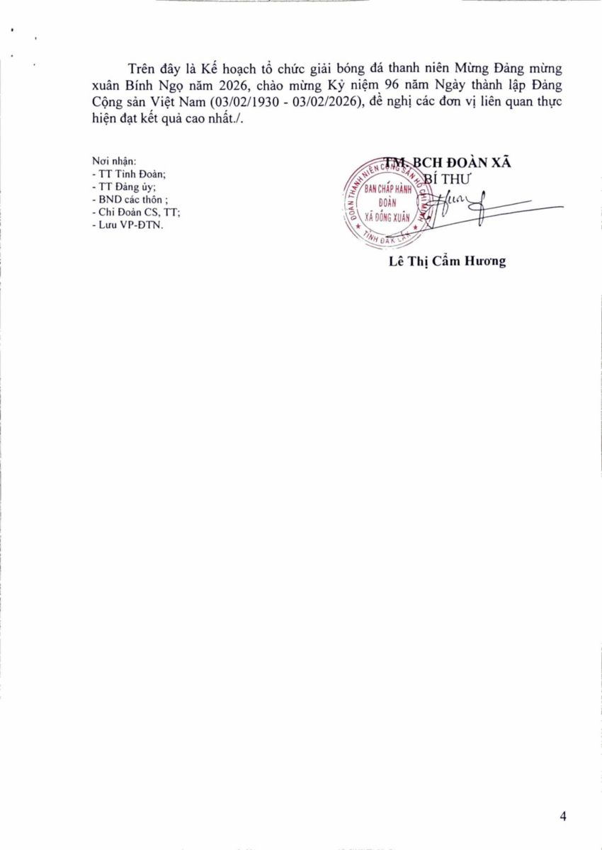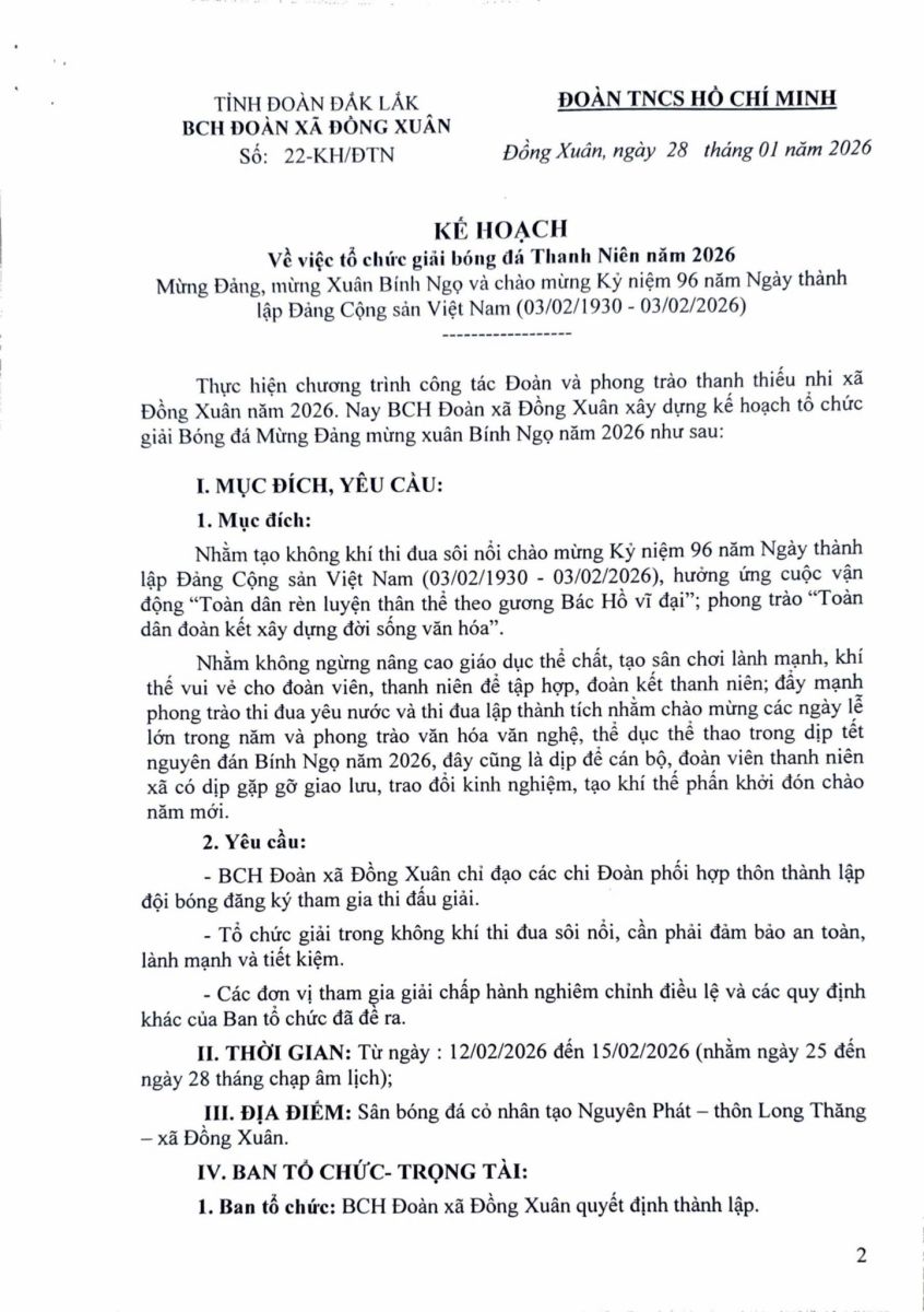 Nhằm thiết thực chào mừng Kỷ niệm 96 năm Ngày thành lập Đảng Cộng sản Việt Nam (03/02/1930 – 03/02/2026), đồng thời tạo sân chơi lành mạnh, nâng cao đời sống tinh thần cho đoàn viên, thanh niên, BCH Đoàn xã Đồng Xuân ban hành Kế hoạch tổ chức Giải bóng đá Thanh niên mừng Đảng, mừng Xuân Bình Ngọ năm 2026.