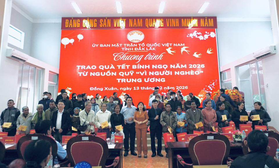 Sáng 13/02/2026 (nhằm ngày 26 tháng Chạp), tại Hội trường Đảng ủy xã Đồng Xuân, lãnh đạo tỉnh Đắk Lắk đã về thăm, chúc Tết và trao quà cho các hộ gia đình có hoàn cảnh khó khăn nhân dịp Tết Nguyên đán Bính Ngọ 2026. Tham dự chương trình có các đồng chí: Lê Đào An Xuân – Tỉnh ủy viên, Phó Trưởng đoàn chuyên trách Đoàn ĐBQH tỉnh Đắk Lắk; Phạm Văn Bảy – Tỉnh ủy viên, Phó Chủ tịch Ủy ban MTTQ Việt Nam tỉnh; cùng đại diện lãnh đạo địa phương và 160 hộ dân thuộc 4 xã: Đồng Xuân, Xuân Lãnh, Xuân Phước và Phú Mỡ.