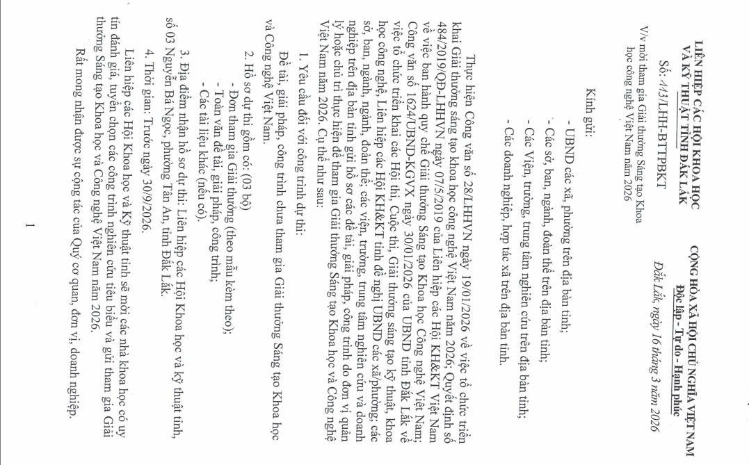 Về việc mời tham gia Giải thưởng Sáng tạo Khoa học công nghệ Việt Nam năm 2026